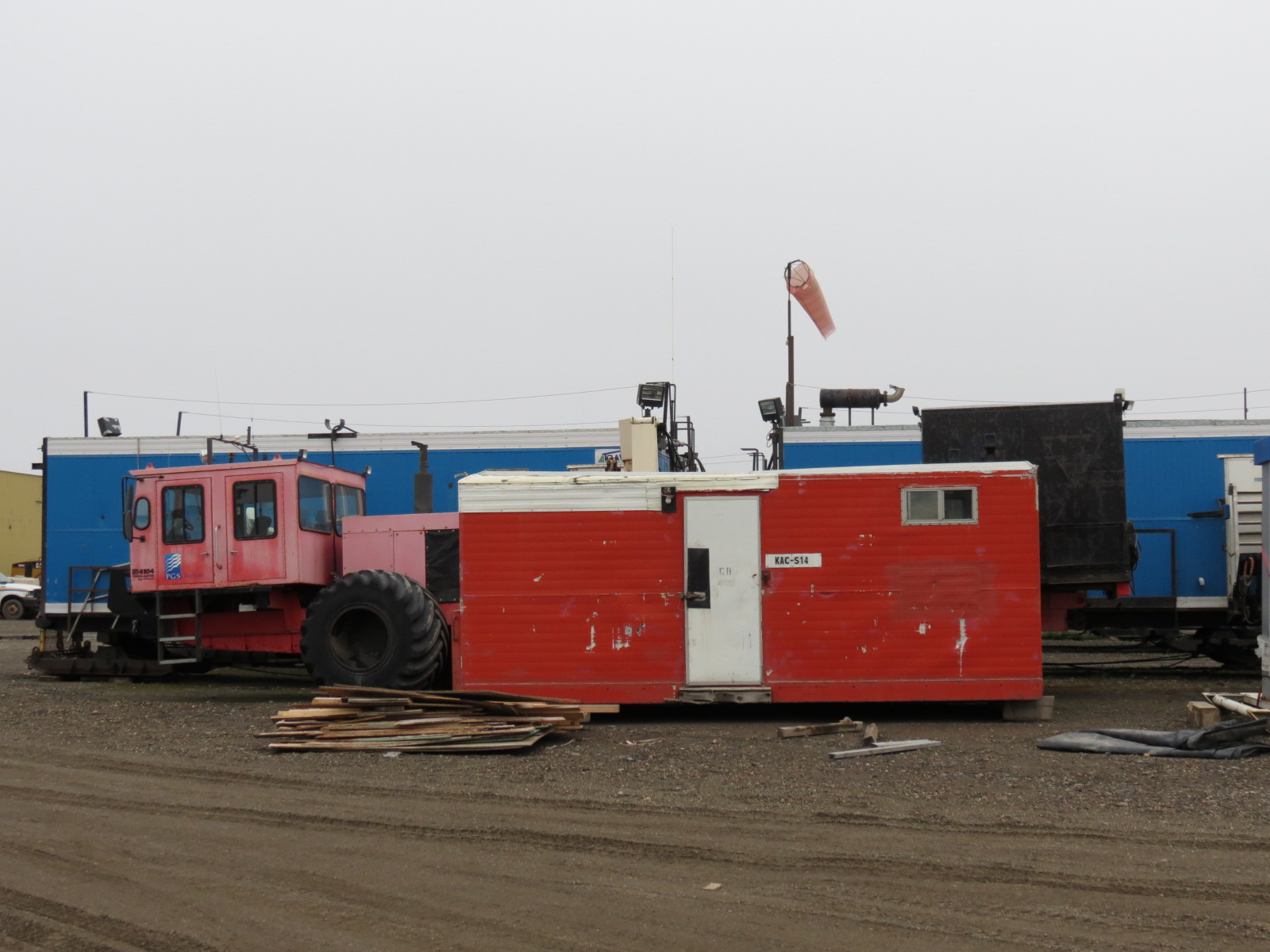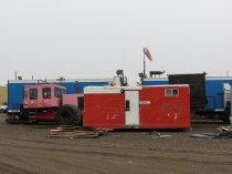 Deadhorse Camp is literally a bunch of work trailers, a garage, and rows of heavy machinery stored on a gravel pad out on the arctic coastal plain.  There are large trucks of all kinds and SUVs parked near every building.  Buildings are surrounded by piles of wood, metal in all forms, and either earth moving machinery or mobile trailers on skis made to travel across the frozen ground.  Clearly this is a place for hardy people doing work in a hostile environment.